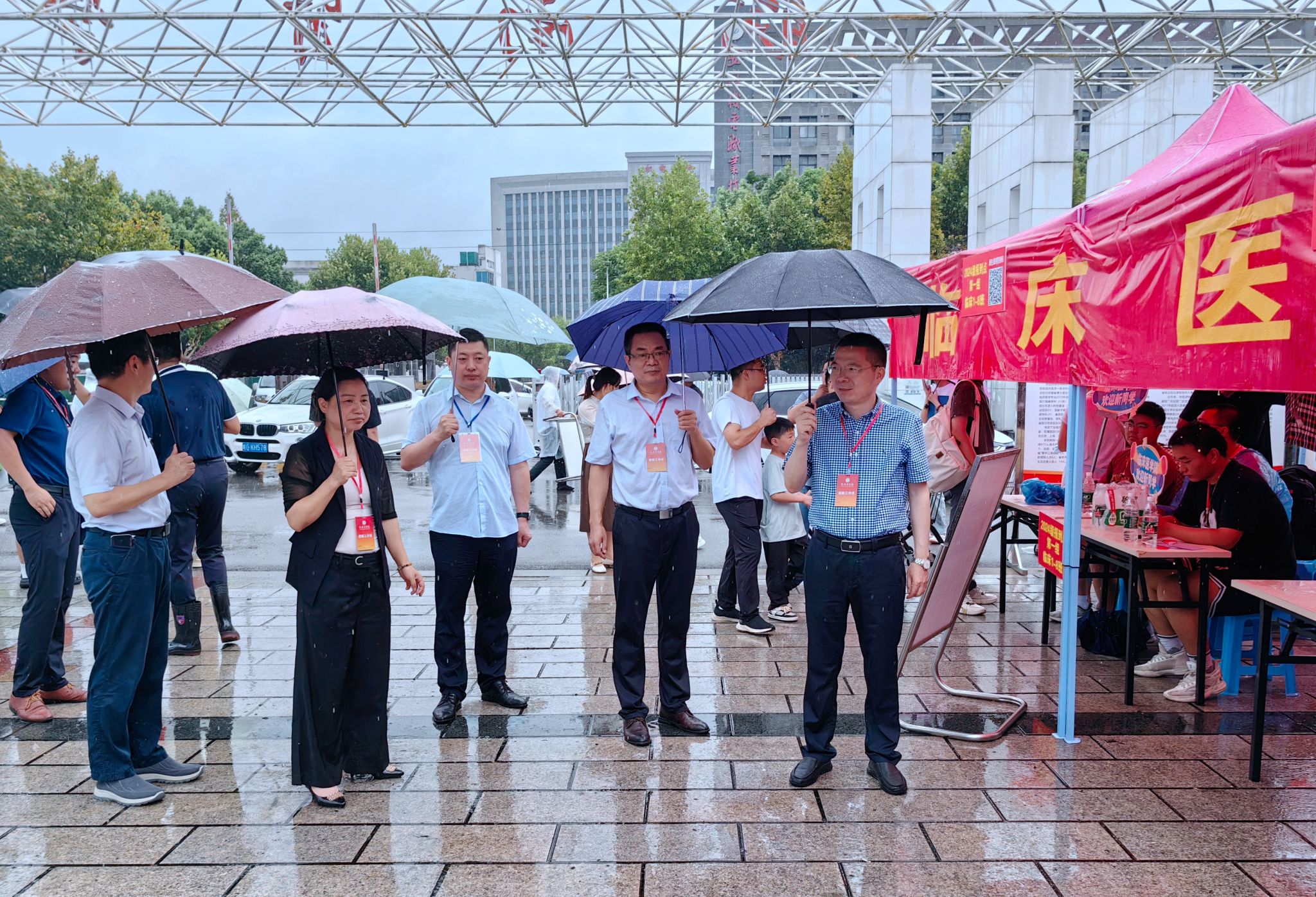 全心全意迎新生,全力以赴办实事。在迎新现场,还有一支由师生党员组成的志愿服务队。他们统一佩戴党徽,亮出党员身份,用心用情用力投身迎新工作中,开展交通疏导、防诈防推销宣传、新生引导咨询、行李搬运等工作任务。尤其迎新首日,由于校门口市政道路维修、校内停车空间有限,为避免自驾车辆拥堵,保证交通通畅,由教师党员组成的党员先锋队早早到达指定位置,配合保卫处耐心引导新生报到自驾车辆有序进校、安全停放、下卸行李、定向驶离。虽然穿着雨衣,但雨水和汗水却早已浸湿了他们的衣背。据统计,迎新期间,全校共设立党员服务站16个,成立党员服务队16个,有近600名师生党员参与迎新工作中,他们以实际行动擦亮了党员底色,让党旗在迎新一线高高飘扬,让党徽在迎新一线闪闪发光。