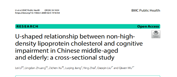 近日,检验学院临床微免教研室武其文教授课题组在《BMC Public Health》发表题为《U-shaped relationship between non-high density lipoprotein cholesterol and cognitive impairment in Chinese middle-aged and elderly: a cross-sectional study》(中科院二区,Top期刊)学术论文。
